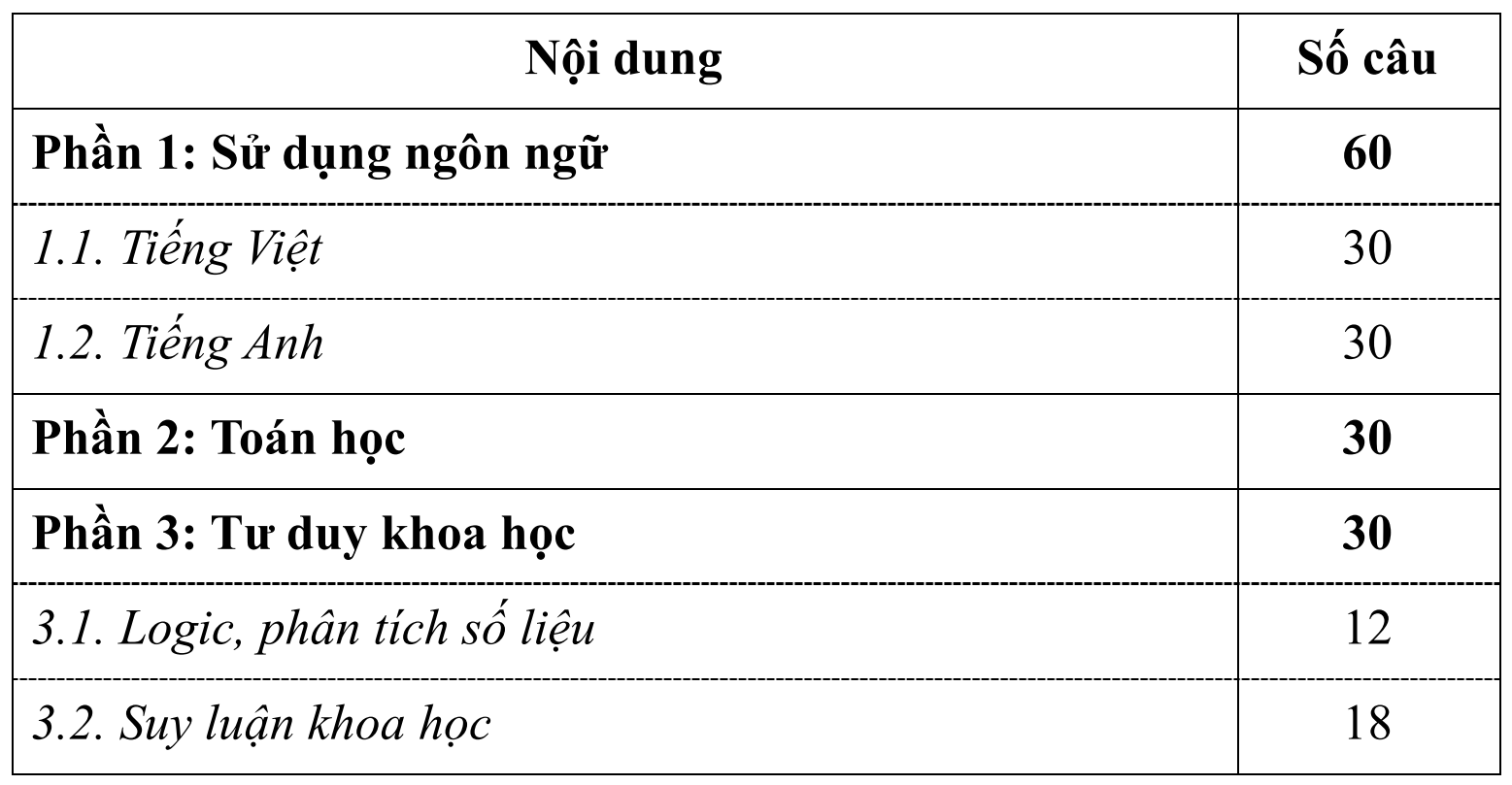 Cấu trúc và nội dung đề thi ĐGNL ĐHQG-HCM năm 2026 được triển khai trên cơ sở cấu trúc đề thi đã được điều chỉnh và áp dụng từ năm 2025, phù hợp với Chương trình giáo dục phổ thông 2018; nhằm đánh giá chính xác năng lực học đại học của thí sinh, bảo đảm tính công bằng và tạo cơ hội bình đẳng trong tiếp cận giáo dục đại học cho tất cả thí sinh. Bài thi ĐGNL ĐHQG-HCM gồm 120 câu hỏi trắc nghiệm khách quan đa lựa chọn, thời gian làm bài 150 phút, thực hiện thi trên giấy. Cấu trúc bài thi bao gồm: